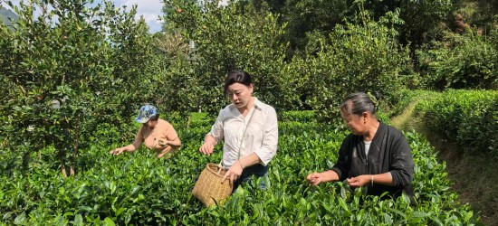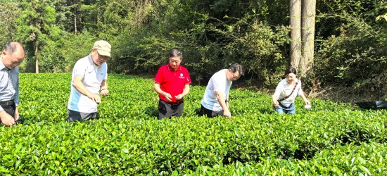 老领导一行走进茶园体验采摘,查看茶叶长势情况。